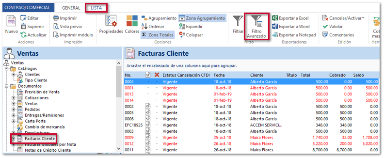 Desde la vista que deseas configurar (Eje: Facturas Cliente), identifica la pestaña LISTA y haz clic la opción Filtro Avanzado.
