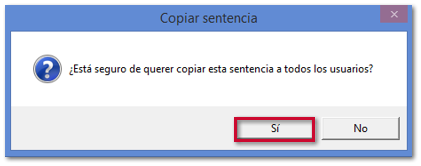 Al dar clic en el botón Copiar a todos los usuarios, se mostrará el siguiente mensaje: ¿Está seguro de querer copiar esta sentencia a todos los usuarios?, y has clic en la opción Sí.