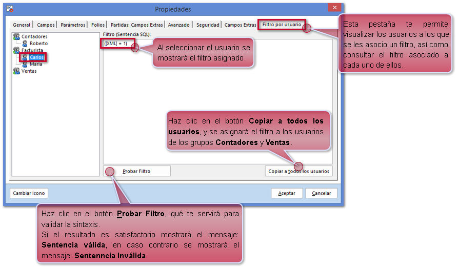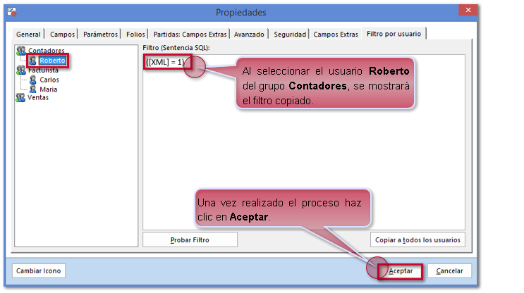 Selecciona el usuario o los usuarios que se encuentran dentro de los grupos distintos a Facturista y podrás validar que en el campo Filtro (Sentencia SQL) se mostrará el filtro copiado, posteriormente haz clic en Aceptar.