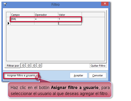 Se abrirá la ventana Filtro, configura el filtro y haz clic en el botón Asignar filtro al usuario.