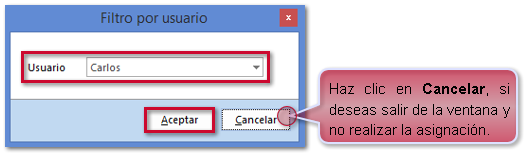 Para asignar el mismo filtro a otro usuario haz clic nuevamente en el botón Asignar filtro al usuario, selecciona el usuario y haz clic en Aceptar.