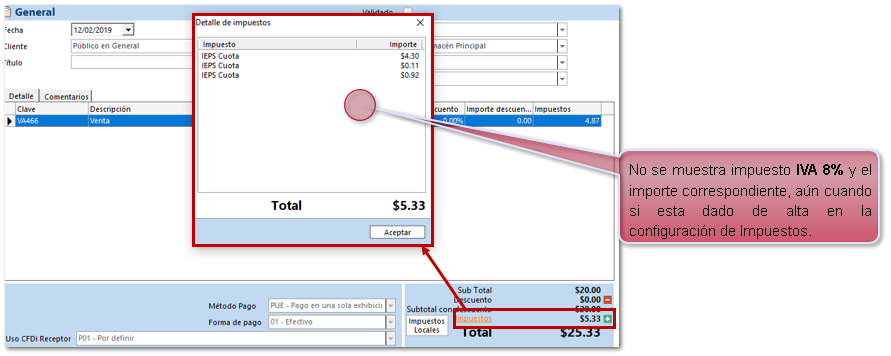 En versiones anteriores a la 3.4.1 de CONTPAQi® Comercial Start/Pro, al visualizar el detalle de impuestos del documento de Factura Global por Nota no se mostraba el IVA 8% aún cuando se tenia configurado.