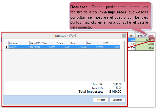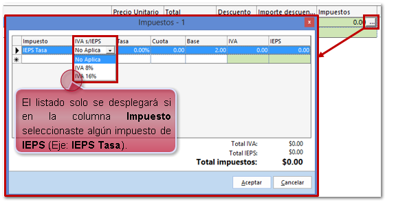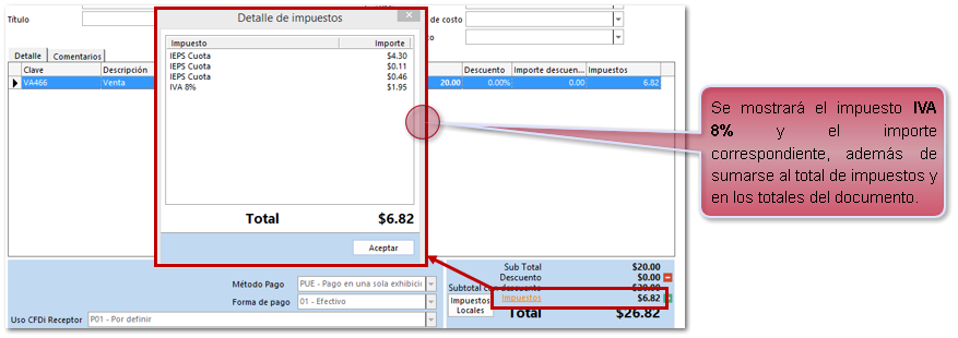 Si seleccionas esta opción, se calculará el 8% de IVA sobre el importe base del IEPS y en la columna IVA deberá mostrarse el importe correspondiente.