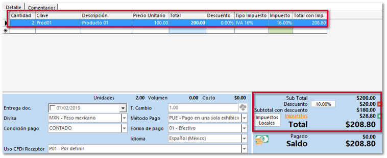 Si se capturan Descuentos a nivel de movimiento o documento, estos se aplicarán antes que el impuesto asignado en el movimiento, para el calculo se tomará en cuenta el importe de la columna Total.