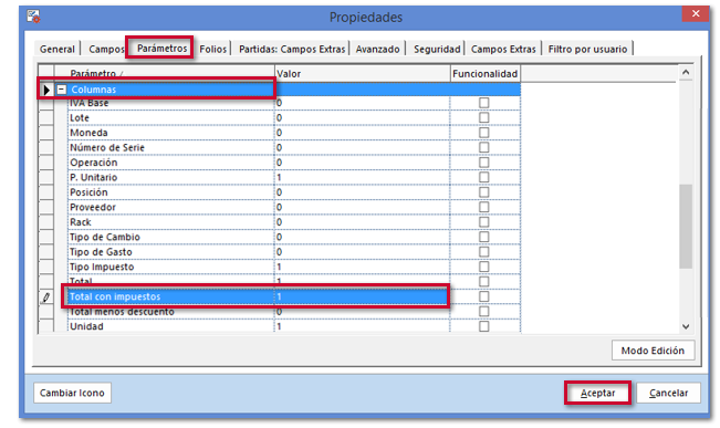 Selecciona la pestaña Parámetros, desprende la información dentro de Columnas, identifica la columna Total con Impuestos, asigna el valor =1 y haz clic en Aceptar.