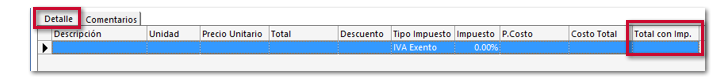 Con esta funcionalidad podrás capturar el precio del producto en la columna con Total con Imp., y se realizara el cálculo a partir del precio capturado y del impuesto que tengas asignado al movimiento.