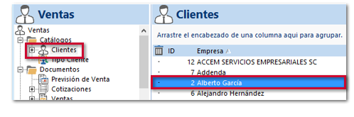 Ingresa a la sección de Ventas, dentro de Catálogos selecciona Clientes; identifica el cliente y haz doble clic sobre el registro.
