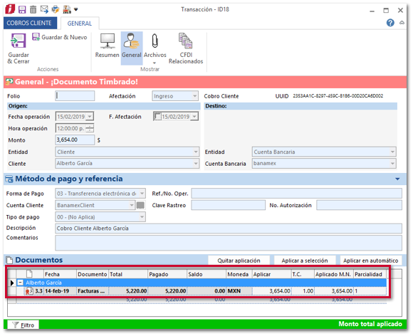 ![]() Al generar y timbrar el Cobro Cliente con el documento de factura asociada.