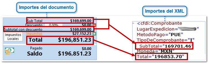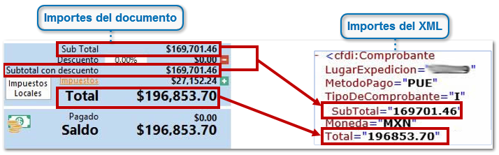 Y podrás notar que el Subtotal y el Total no corresponden con los importes que contiene el XML.