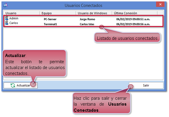 Importante: la información de esta columna se actualizará en automático al ingresar a la ventana Usuarios Conectados o al hacer clic en el botón Actualizar.