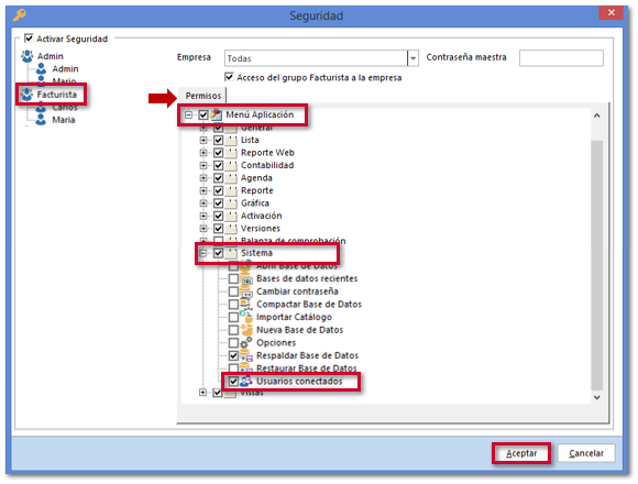 En la pestaña Permisos identifica el Menú Aplicación, dentro de éste desprende las opciones de Sistema; habilita la opción Usuarios conectados y posteriormente haz clic en Aceptar.