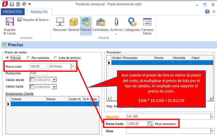 Anteriormente, el sistema arrojaba el mensaje "El precio de lista es menor que el precio de costo" cuando se capturaba un importe menor al costo, pero en moneda diferente a la moneda base.