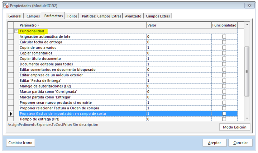Ahora podrás configurar el sistema para prorratear los costos de importación por partida del documento. Se agrega a los parámetros de los documentos en funcionalidad el atributo: Prorratear gastos de importación en campo de costo.