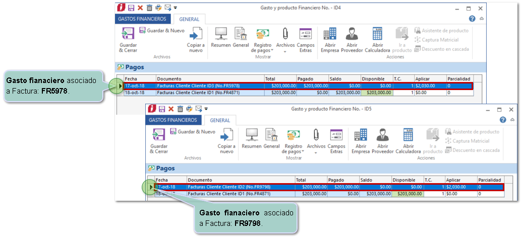 Se tiene dos Gastos Financieros y cada gasto financiero tiene relacionada una factura distinta.