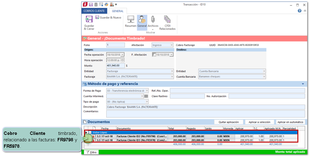 En tu documento de Cobro Cliente podrás relacionar las Facturas y timbrar el documento.