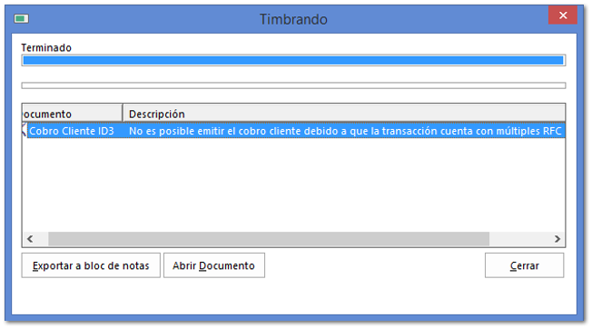 X Cobro Cliente ID3: No es posible emitir el cobro cliente debido a que la transacción cuenta con múltiples RFC receptor; solo puede emitirse el recibo electrónico de pagos si el receptor es el mismo que el de los documentos relacionados.