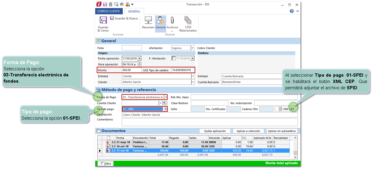 Dentro del documento Cobro cliente en moneda dólar deberás seleccionar la Forma de Pago: 03-Transferencia electrónica de fondos y el Tipo de pago: 01-SPEI.