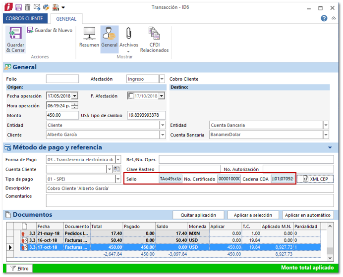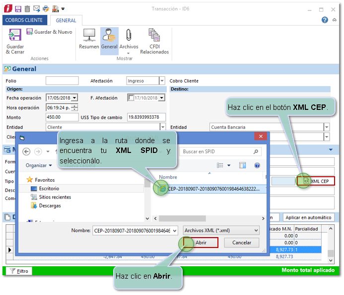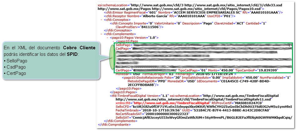 Se incluye en el sistema CONTPAQi® Comercial start/Pro la facilidad de adjuntar tus XML de SPID (Sistema de Pagos Interbancarios en Dólares) en los documentos de Cobros Cliente, con la finalidad de que se muestren los elementos: CertPago, CadPago y SelloPagodentro, dentro de tus XML de Cobros cliente.