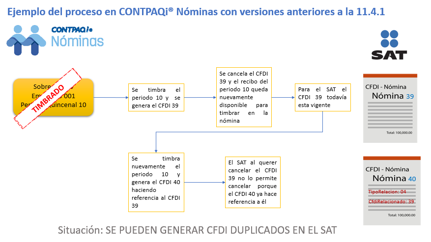 Escenario que pudo haberse presentadoSi cancelaste y retimbraste recibos con versiones anteriores a la 11.4.1 de CONTPAQi® Nóminas a partir del 1 de noviembre del 2018, puede ser que haya llegado a generarse duplicidad de CFDI, en caso de que al momento de retimbrar desde el sistema, el SAT aún no haya actualizado el estado a cancelado del primer recibo de nómina.