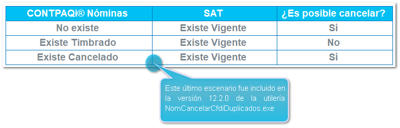 A partir de la versión 12.2.0 de la utilería externa NomCancelarCfdiDuplicados.exe se permite la cancelación en el SAT de aquellos recibos que se encuentran timbrados en el SAT, pero cancelados en CONTPAQi® Nóminas.
