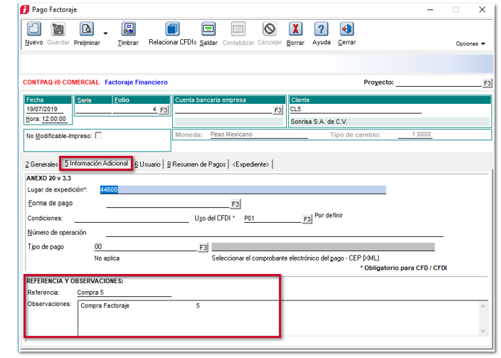 Haz clic en la pestaña 5 Información Adicional, en el apartado REFERENCIA y OBSERVACIONES podrás comprobar que el pago está relacionado a la compra.