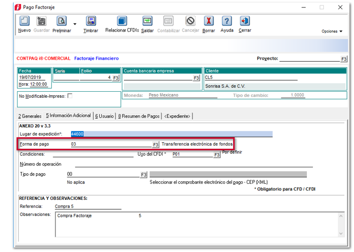Asigna la Forma de Pago, por ejemplo, 03-Trasferencia electrónica de fondos.