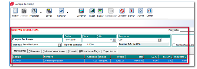 Captura el documento de Compracon fecha del 18 de julio a “Sonrisa S.A.” por el importe de la comisión por el gasto de exhibición $ 9,960.00 con IVA incluido.