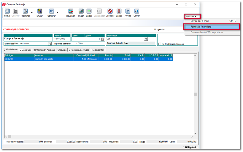 Haz clic en Opciones, y selecciona Factoraje financiero.