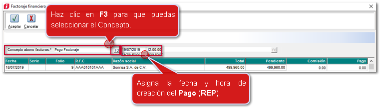 Seleccionar el Concepto abono facturas (Ejemplo: Pago Factoraje), asigna la Fecha Abono y la Hora abono en la que se generará el pago (REP).