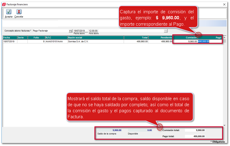 Para consultar el documento de Pago, haz clic en F6 del campo Concepto de abono factura.