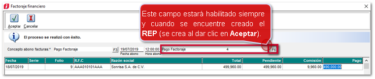 Una vez asignados y capturados los datos correspondientes, haz clic en Aceptar (se creará el REP).