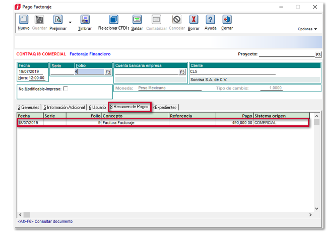 Se mostrará el documentos de Pago, dentro de la pestaña 8 Resumen de Pagos podrás consultar el pago que se realizo a la factura.