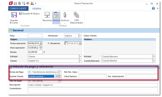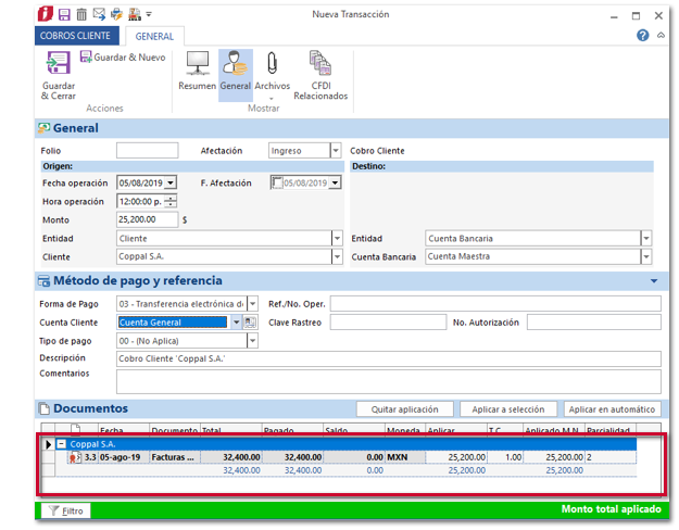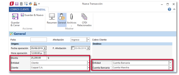 Se mostrará la ventana de Cobro Cliente, con el importe pendiente de la factura; asignando el cliente Coppal S.A. por default; en el apartado Destino elige los datos deseados, en este caso seleccionaremos Cuenta Bancaria y la cuenta bancaria registrada.