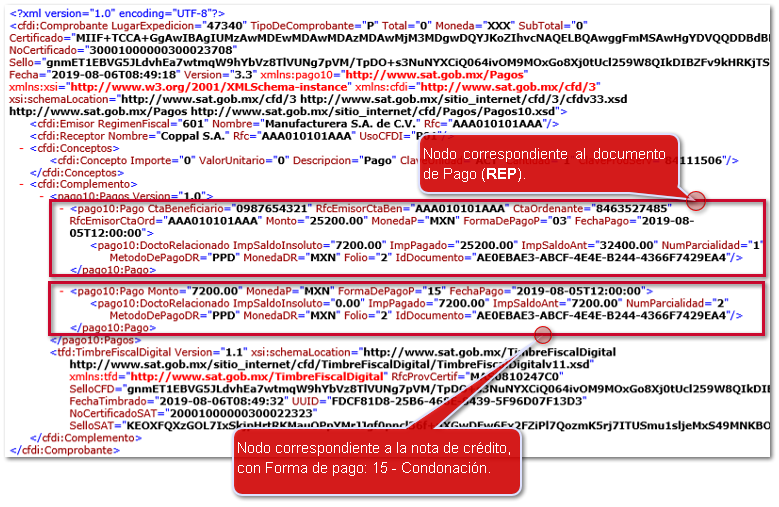 Dentro del XML del REP, podrás validar los dos nodos de Pago correspondientes.