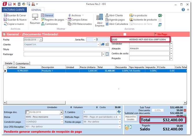 Genera y timbra la factura para “Coppal S.A.” por la cantidad de $ 32,400.00.