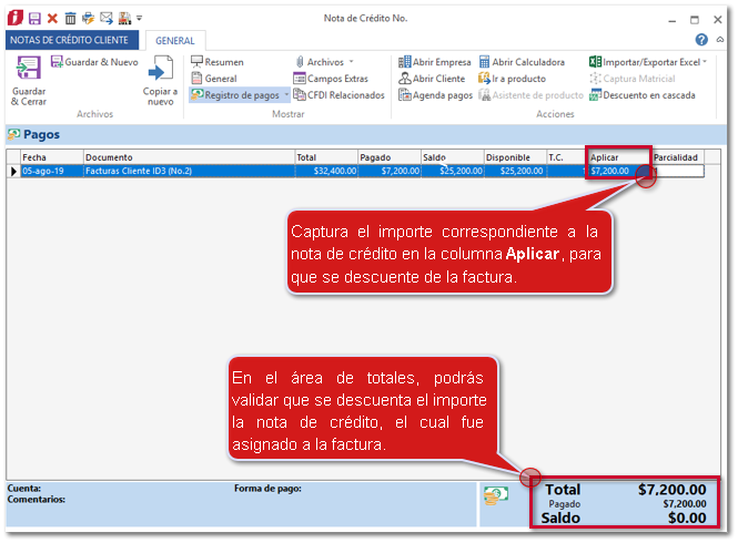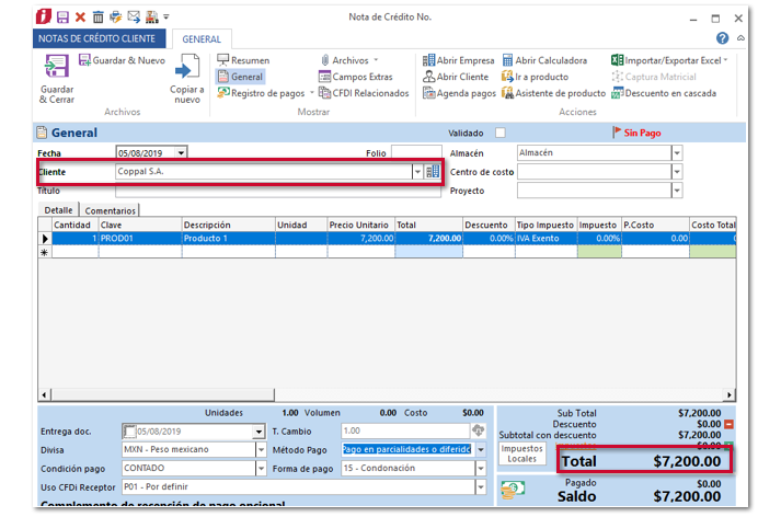 Realizar la nota de crédito por la cantidad de $ 7,200.00.