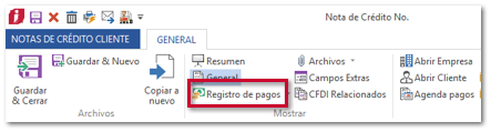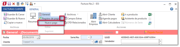 Para generar el documento de Cobro cliente (REP), haz clic en la flecha del campo Registro de pagos y selecciona la opción Nuevo pago.