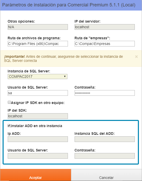 Si en la instalación del primer sistema CONTPAQi® en tu equipo, deseas utilizar una instancia distinta para el ADD, debes habilitar la casilla "Instalar ADD en otra instancia" y capturar los datos que te solicita.