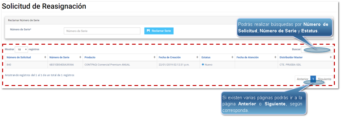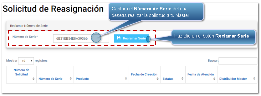 En la parte derecha, se mostrará el apartado de Solicitud de Reasignación, y podrás capturar el Número de Serie y realizar la solicitud.