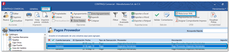 Dentro de la vista Pago Proveedor, selecciona el documento que deseas asociar y haz clic en el botón Relacionar XML de la pestaña LISTA.