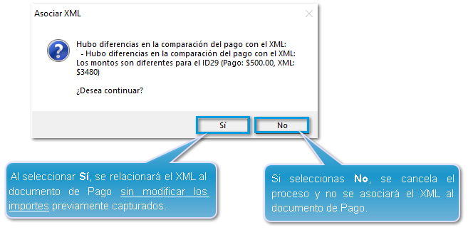 Compara el monto del XML vs Monto del pago, si son diferentes se mostrará el siguiente mensaje: