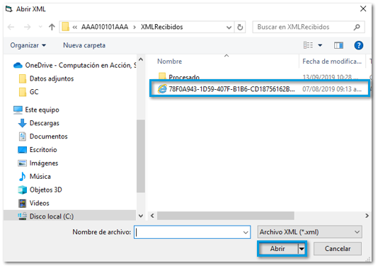 Se mostrará la siguiente ventana para que realices la búsqueda del archivo XML REP que deseas asociar al documento de Pago Proveedor, selecciónalo y haz clic en Abrir.