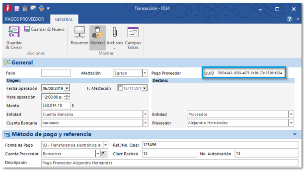 Al consultar el documento de Pago Proveedor, podrás validar que se muestra el UUID del XML asociado.