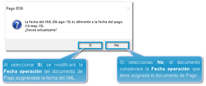 Comparará la FechaPago del XML vs la Fecha operación del documento de Pago Proveedor, si es diferente mostrará el siguiente mensaje: