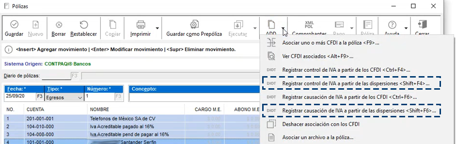 Existen usuarios que no utilizan las dispersiones de CONTPAQi® Bancos, y al registrar sus documentos bancarios dejan las dispersiones en cero (sin importes), crean su documento, captura el importe del pago y asocian sus XML, en sus pólizas utilizan la combinación de teclas daba < Ctrl + F4 > y < Ctrl + F6 > y como sus dispersiones están en cero, los importes de IVA se generaban también en cero, y era necesario capturar los importes de las dispersiones a pesar de que no estaban usando y este es el motivo por el que se agregaron las nuevas opciones en el ADD, para que se pueda decidir si los desgloses de IVA se generan partiendo de los CFDI o tomando como base el importe de las dispersiones.