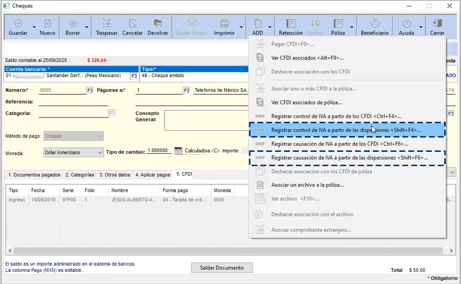 En este caso tanto en documentos de ingresos como de egresos, se colocarán los importes pagados en la terminal especializada, en la pestaña de dispersión, solo en el caso de la compra tenemos un caso especial porque si la compra no tiene asociado su CFDI no se podrá calcular el IVA o el asiento contable de lo pagado por el CFDI.