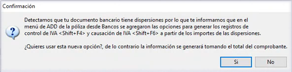 Por esto es que a partir de esta versión, al utilizar la combinación de teclas < Ctrl + F4 > y < Ctrl + F6 > se toma en cuenta el total de los CFDI asociados, sin embargo se identifica cuando la dispersión es diferente de cero, y al generar el control de IVA se confirma que tienes dispersiones registradas en el documento y te brinda la opción de tomar como base para el cálculo de IVA el total de dichas dispersiones en el lugar del total de los CFDI o viceversa y te envía el siguiente mensaje para que decidas que opción utilizar: