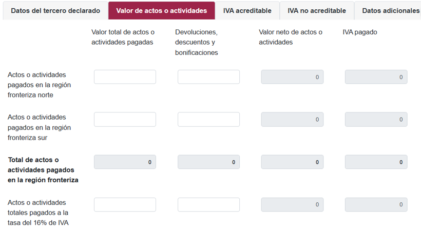 Ampliación de campos: La declaración cambia por completo, el número de campos disponibles para el llenado de la declaración pasa de 24 a 54 campos divididos en 5 secciones (1.Datos del tercero declarado, 2.Valor de los actos o actividades, 3.IVA acreditable, 4.IVA no acreditable, 5.Datos adicionales), ofreciendo mayor capacidad de detalle.