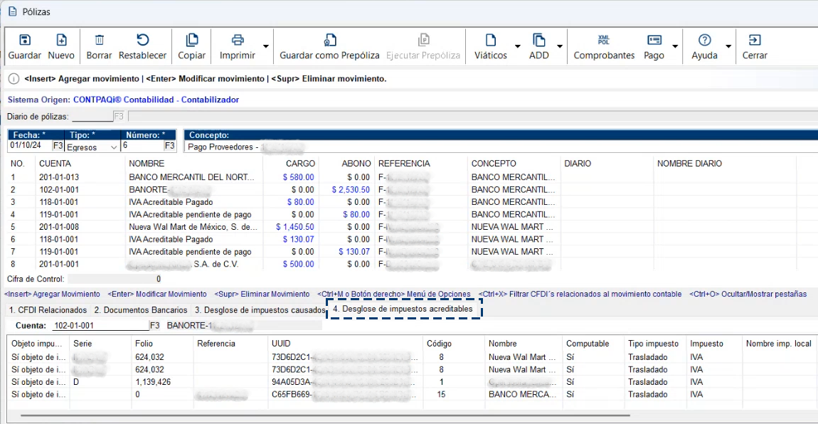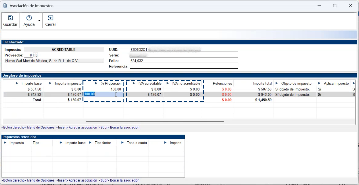 Recuerda que si utilizas la combinación de teclas "Ctrl + F4", se generan los desgloses de los impuestos acreditables a partir de los CFDI asociados a la póliza. Como puedes ver en la siguiente imagen, se incluye la columna "% Proporción", que en este caso el valor de "100", indica que se está acreditando el 100% del IVA, por lo que en la columna "IVA acreditable" se muestra el importe total del IVA y en la columna "IVA no acreditable" se muestra "0".