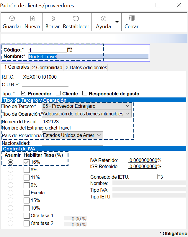 Ingresa al menú Control de IVA, elige la opción Padrón de Clientes/Proveedores. Registra al proveedor, indicando el código, nombre, tipo de tercero, tipo de operación, nombre del extranjero y tasa de IVA.